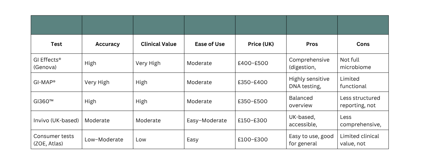It offers stool testing that combines microbiome analysis with key functional markers, with the advantage of being locally processed and easily accessible in the UK.